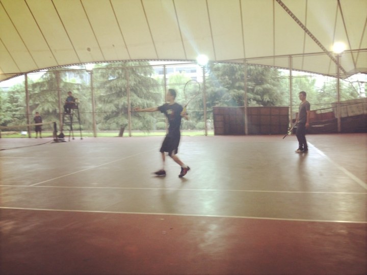 小组赛第二轮我们对阵去年的冠军队电气学院。在对方先赢了一盘男单比赛之后,我们的男单二周晨晖同学积极调动,勇猛进攻和不屈救球,最终(6:2)击败对方男二号,随后李敏同学也取得女单比赛的胜利,紧接着是徐迪恺同学和周晨晖同学的男双,更是以6:0的大比分横扫电气,最终确保了我们小组第一的位置,同时也八强出线。(下图为男双比赛照片)