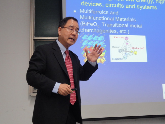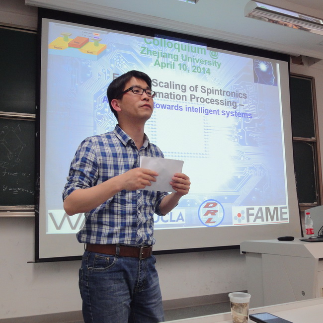 本次报告中,王康龙教授以“Energy Scaling of Spintronics A new paradigm”为题,以其课题组研究的自旋转移矩STTMeRAM计算机存储技术为例,介绍分析了低损耗智能系统的发展。报告首先简要回顾了当今CMOS领域所面临的重大挑战,提出了计算机系统发展对低能量、高速度、高稳定性的电子存储器件的需求,比较了STT技术与其他存储技术的性能差异。利用自旋霍尔效应产生的巨大移矩可以极大降低磁转换能。王教授课题组利用电压取代STT电流将数据写入存储,利用电势差进行磁位的转换,将数据写入存储器,这消除了通过导线移动大量电子的必要,减少了热量的产生,极大提高了能量转换效率与存储密度。