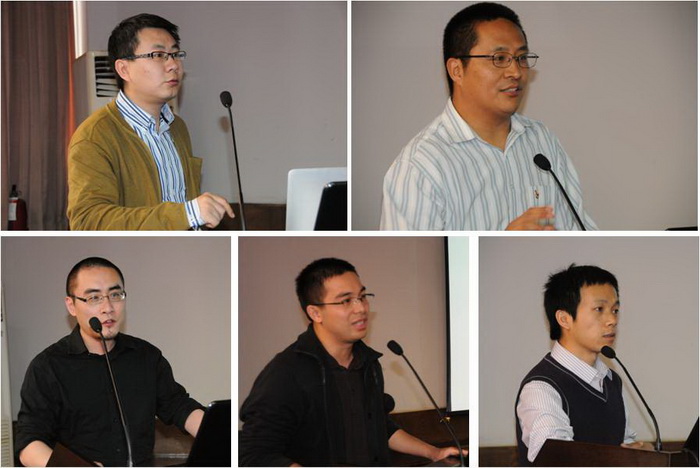 五位青年学者进行报告,从左至右依次是田鹤、马天宇、支明佳、杜宁、刘小峰