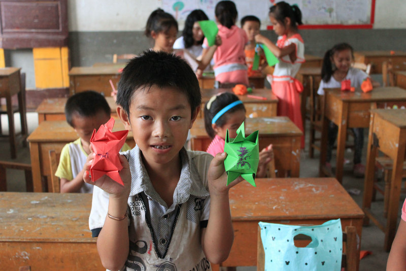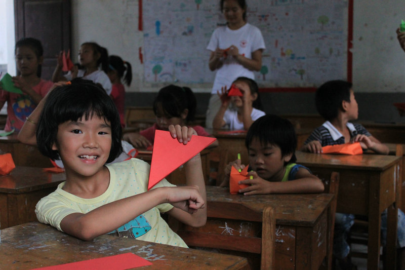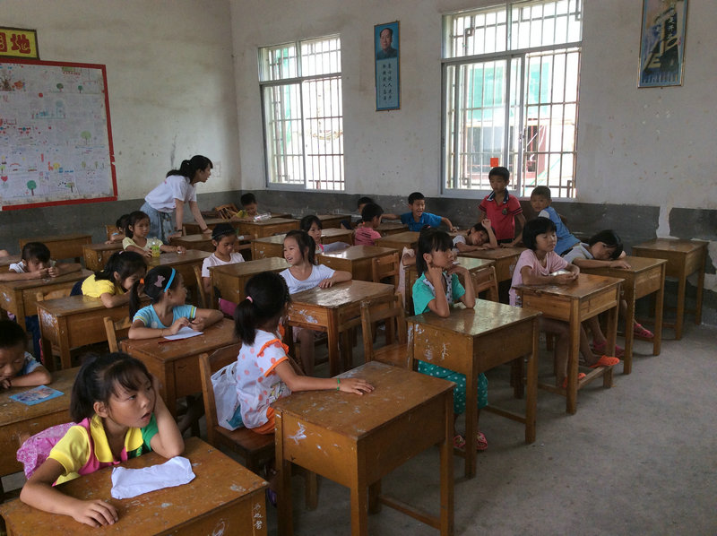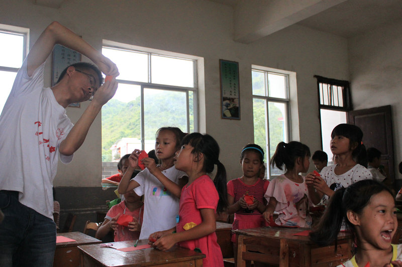 我们的支教团队共开设数学,英语,历史地理,艺术,素拓和体育等6个课程。对最基础的学科数学,我们主要进行巩固拓新。英语课山村里的孩子接触比较少,基础较差,我们则更强调基础。历史地理课旨在让他们开拓视眼,了解到一些他们从没接触过的东西。艺术课则教给他们一些比较娱乐的活动,如剪纸,橡皮泥,书法,画画,唱歌等,让他们能全面发展自己的技能。素拓课则是让他们在玩的过程中学习,在游戏中提升素质。体育课引导他们强身健体。第一次做老师的我们,的确在一开始有些迷茫。不知道他们的教学水平,也不知道该如何吸引他们的注意力,更不知道当出现特殊情况的时候该如何处理才更妥当。但在3天的教学适应之后,大家也逐渐开始找到一些小窍门。一二年级的小朋友很淘气,也很吵闹,他们渴望老师听到他们的声音,特别需要老师的鼓励与关爱,而对付他们最好的办法不是和他们讲道理,而是赞扬做的好的小朋友,他们渴望得到表扬,自然而然会向他学习。三四年级的小朋友是最中和的,他们没有弟弟妹妹的吵闹,也没有哥哥姐姐的害羞,他们是最善于向你表达他们情感的人,因此也最好教。五六年级的小朋友是最静的,特别是女生,他们往往不怎么主动回答问题,即使他们都懂,这时就需要老师的配合,让他们战胜自己的害羞。只要用心体会,我们就能走进他们的内心世界,从而帮助他们。