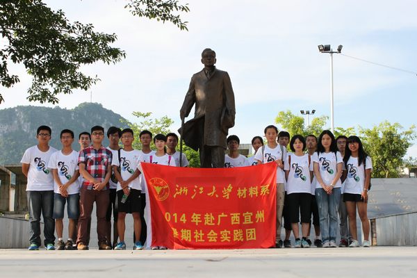 浙江大学西迁广场位于宜州城东文庙公园,宜州一中近旁,建成于2007年。下午4时半左右,同学们怀着激动而热烈的心情来到了西迁广场,大家都是第一次来,对这次参观都充满了无比的期待。广场正中是竺可桢老校长的塑像,于2013年树立。塑像中的竺校长依旧是西迁时那身熟悉的打扮,身着风衣,戴着眼镜,右手握着手杖,左手持着帽子,风度翩翩,一副学者之气,永远担当着浙大学子们的领路人。在与竺校长合影时,大家个个严肃认真。在竺校长塑像的左右各栽着一棵大树,如同两尊守卫一般。环绕着塑像与大树有三面倾斜的石壁,石壁上从右到左依次雕刻着浙大的校歌歌词,浙大的校训,竺校长所写的《国立浙江大学宜山学舍记》以及浙大西迁路线图。同学们有的站在校歌歌词之前情不自禁地唱了起来,有的用手指在图上“重走”了西迁路,有的仔细阅读了《国立浙江大学宜山学舍记》,了解了浙江大学西迁至广西宜山的背景、经过以及在宜山办学的困难与艰辛。大家沉浸在西迁文化浓厚的氛围之中。
