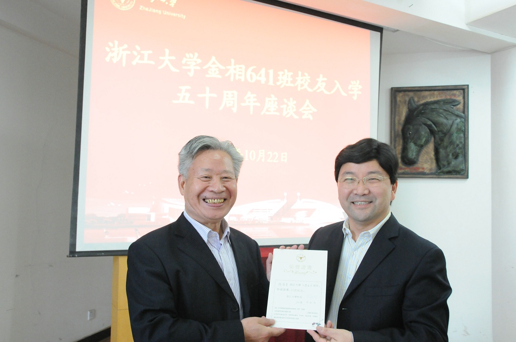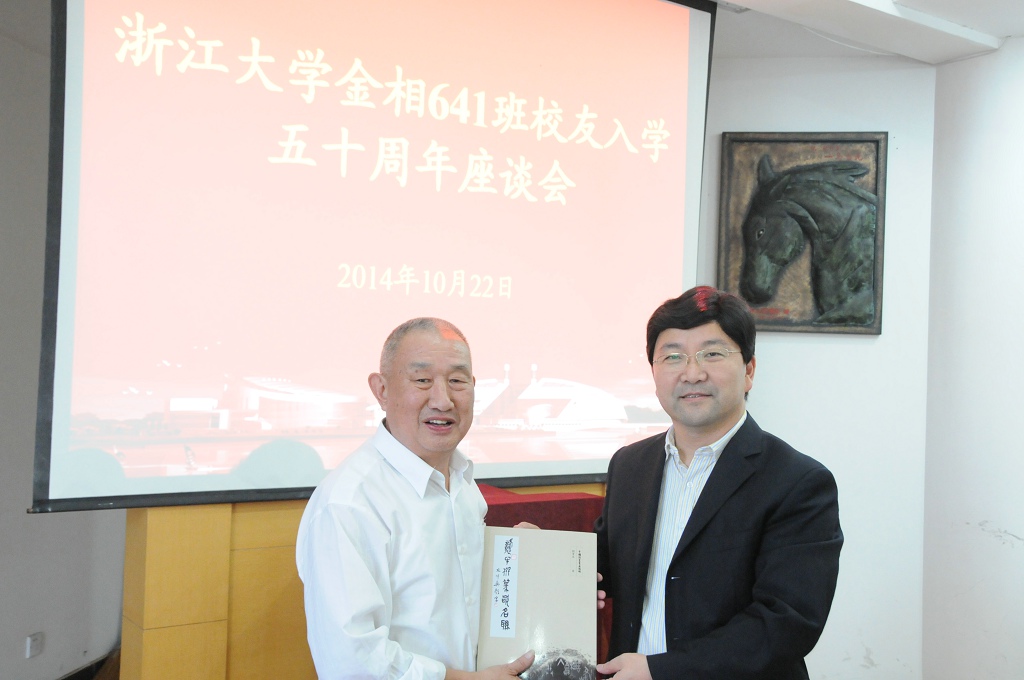 在材料科学与工程学院曹光彪楼会议室,学院副院长陈立新教授代表学院欢迎老校友,为校友们介绍了学院发展概况和教学科研取得的成绩,介绍了校友总会和材料科学及工程学院分会的工作情况,校友们为学院取得的成就高兴,祝福学院今后更上一层楼。陈院长为每位校友颁发了由校长林建华签名的入学50周年荣誉证书,赠送了学校徽章等纪念品,与校友们进行了亲切交谈并合影留念。校友们回顾了当年的学习生活以及毕业后45年来的工作生活的情况,母校的学习为校友们以后的人生工作事业发展打好了良好的基础,校友以浙大为荣,感恩母校培养,不忘师生情谊。刘贵生校友向学院赠送了他的最新专著《憨牛撰篆嵌名联》。
