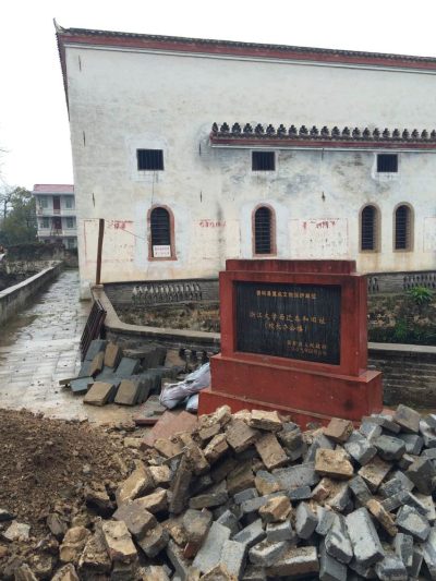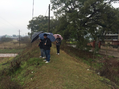 泰和县的天气最近一直不好,雨下个不停,大家按照地图,冒雨来到了上田村。当年的浙大办学旧址已经变成了如今的泰和六合中学。与保安沟通后,大家顺利进入学校参观。在校内,我们看到了当年种下的长青柏,当年浙大师生开会的礼堂;在学校旁边,我们看到了竺可桢校长当初的办公楼,如今已经是泰和县博物馆的第二陈列室。办公楼旁的一汪水池浅而脏,不复当年风韵。在校外数百米远的水泥路边,我们看到了当年浙大为当地做的三件实事之一——防洪堤。没有想象中的高大上,防洪堤如今只是一条土堤,高出地面约1.8米。由于沿着赣江有多处采砂场,防洪堤已多处被毁坏。