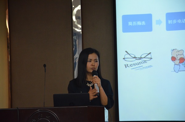 模拟面试之前本次活动的主持人张军娜对活动进行了简短的发言。担当此次活动模拟面试的两位HR有着丰富的面试候选人的经验。此次模拟单面分为招聘流程简介、模拟单面及现场提问三个环节。两位HR首先结合自己的经验向大家展示了公司的一般招聘流程。依次对招聘过程中简历筛选、初步电话面试、第一轮面试、第二轮面试及Offer与入职等流程做出了具体的介绍。在初步电话面试环节介绍中,两位HR从现场随机选择了一位志愿者进行了一场别开生面的模拟。