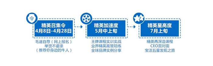 本次活动的第一阶段“精英召集令”即是网申阶段,自本日起至5月5日,接受全国各高校大学生在线报名,大赛组委会将在网申截止后一周内公布入围名单。入围选手不但可以获得宝洁神秘入围大礼,还将拿到珍贵的“精英加速度”入场券,进入精英集训营。“精英加速度”作为活动第二阶段,将于五月中上旬开启,迎接校园精英们的将是内容丰富多彩的王牌课程,品牌大师的全球实例分享,以及众多业界高管的全程陪练,所有参加者都会接受实践挑战。挑战成功顺利晋级的参加者,不仅能获得“宝洁二面直通车 (or 终面直通车)”,更能获得进入第三阶段“精英星高度”的入场券,参与七月上旬的宝洁五星发现之旅,亲历终极精英课程,与知名 CEO 面对面。最后脱颖而出的全国十强将获得由宝洁公司提供的丰厚梦想基金,而全国三强选手将获得哈佛 MBA 商业课程资格及全额赞助。