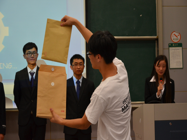 候选者李中旭同学上台后,并不像前几位那样立定在讲桌附近、借助话筒扬声。而是大胆走上讲台,亮出嗓门,完全脱稿演说,一副洒脱而胸有成竹的姿态。他倡导集体参与,说“材料学院是一个大家,我们每个人都是决策者”;他写,“We are server”;第二部门的提出脑洞大开,被提醒即将超时利索收尾,他出色地推出自己,赢得支持。
