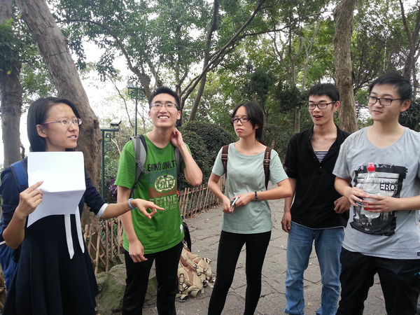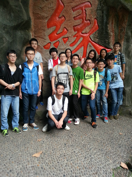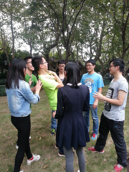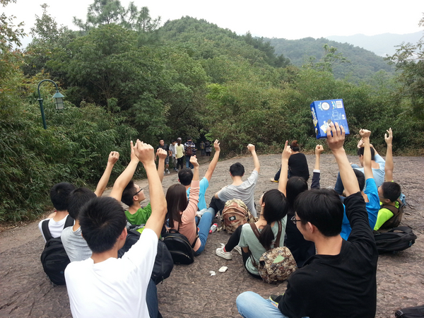 之后,同学们开始登山,途经白沙泉、沙泉亭,行至初阳台,进行了“趣味知识抢答”、“人际交往指引”活动。在趣味知识抢答环节中,两个小分队之间表现出激烈的竞争态势。问题涉及面广,不局限于专业知识范围,包含“浙江大学校歌”歌词填空、“社会主义核心价值观”24字内容、材料专业课程任课老师姓名等与浙大材料学子紧密相关的内容。1301班同学将“富强民主文明和谐,自由平等公正法治,爱国敬业诚信友善”二十四字箴言放在心上,响应党的号召,胸怀祖国人民,奉献社会他人。“人际交往指引”环节旨在加强同学之间的表达与理解,采用“你画我猜”的经典形式,竞猜例如“体育锻炼”、“勤奋刻苦”等正能量词汇。