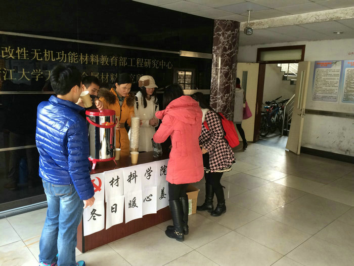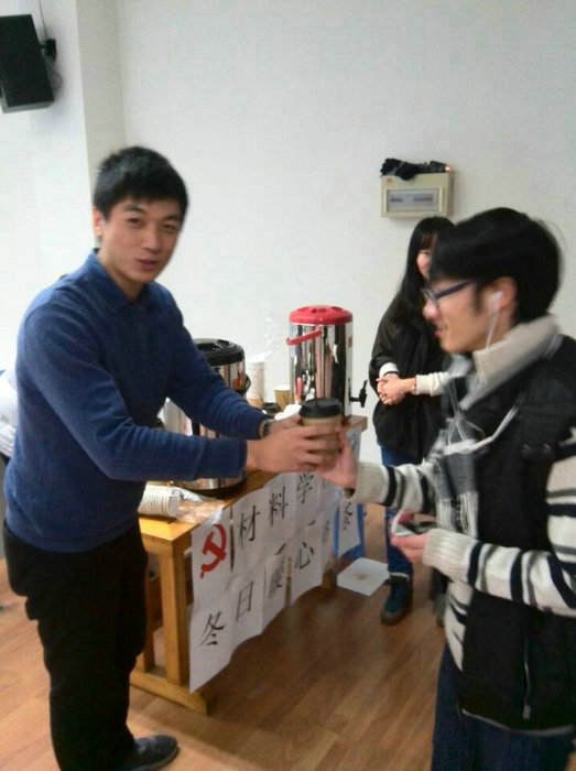为贯彻习总书记讲话精神,强化责任担当,响应材料学院党总支关于“开展一次践行社会主义核心价值观实践活动”的要求,材料学院本科生第二党支部决定于冬学期第四周开展一次为本学院老师和同学们服务的活动。经过支部成员们的讨论,决定在寒冷的冬季为每位老师和同学送上一杯姜汤或奶茶,驱走寒意,带去温暖。