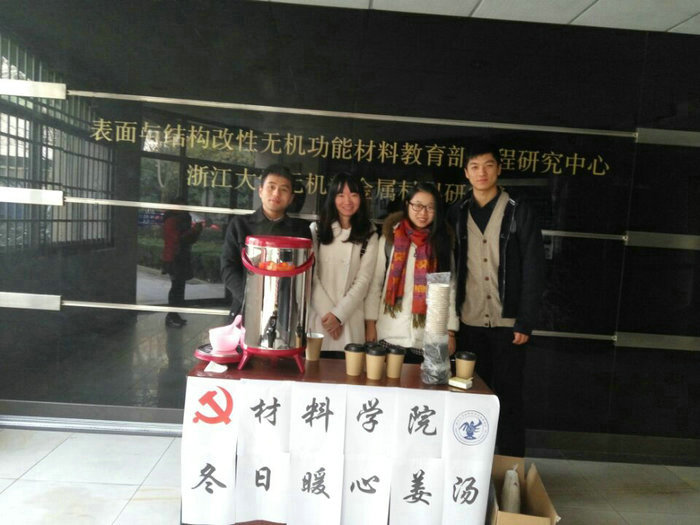 2015年12月7日中午,材料学院本科生第二党支部的成员,与研究生、博士生学长学姐们们,一起在曹光彪大楼一楼门口处以及二楼大厅处,进行了免费赠送姜汤的志愿活动,为了让姜汤姜味十足,支部党员跑到青芝坞购买了生姜加入到保温桶里。最终,活动送出了接近200杯的“暖心”姜汤,让师生们感到这个冬天并不寒冷。活动受到了广大师生的好评,不少老师和同学表示,“姜汤很好喝,要续杯!”