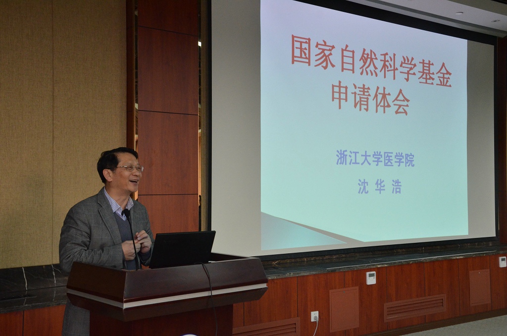 首先,医学院沈华浩副院长做国家自然科学基金申请动员报告。沈院长从国家基金评审程序、评审表等内容分享了国家基金的申请体会。他通过案例说明,从评审表摘要到内容表述到工作基础,多方面分享基金申请撰写技巧,深入浅出,使大家受益匪浅。随后工业技术研究院赵荣祥院长做“实施创新驱动,促进成果转化”报告,论述了成果转化中的若干问题。赵院长详细解读了诸多国家和学校关于创业和成果转化的政策和法规,鼓励广大教师积极实现成果转化。