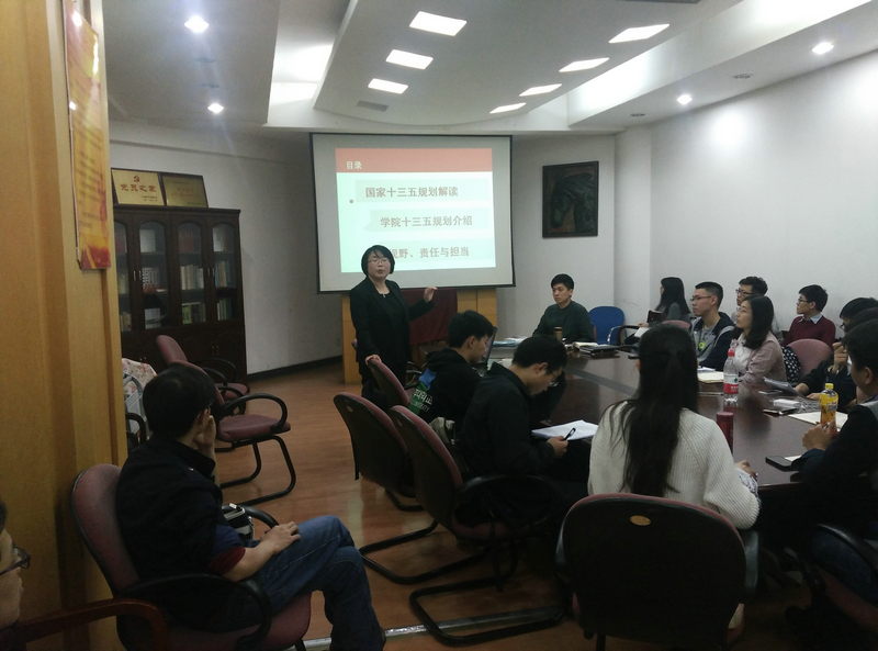 刘艳辉书记主要从三个层面对十三五规划做了一些解读,首先是从国家的十三五规划层面,谈到了五年规划的历史渊源。之后她谈到了十三五规划提出的五大发展理念:创新、协调、绿色、开放、共享。她还对其中的一些关键词,如经济新常态等说明了当前国家经济下行的压力依旧存在,并且国家的兴衰与每个人都息息相关,所以学生们要有宽广的视野,不能总局限在自己的学习、科研生活中。