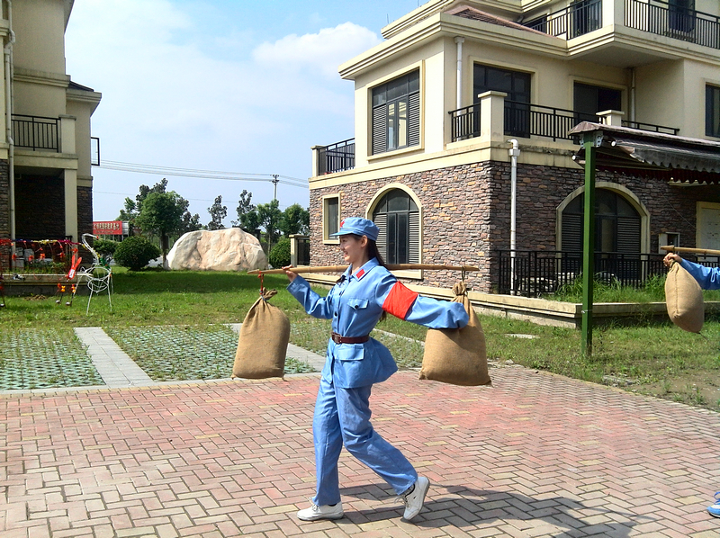 指导员还让大家学习如何扛弹药箱,以及如何挑扁担。