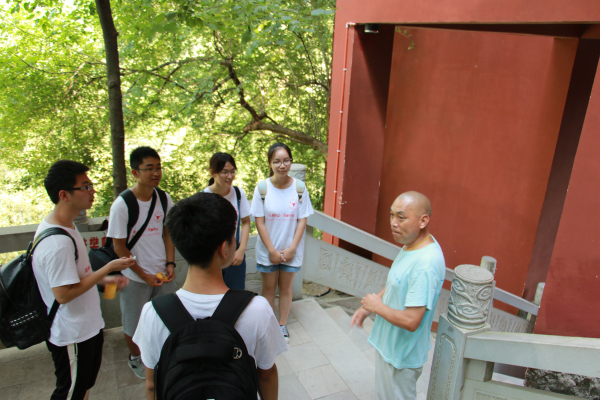 队员们在这里见到了一把断了弦的琵琶,十分好奇,便向该大师请教。大师简而深情地介绍其琵琶的主人是一位患有疾病的少年,虽然身体条件不方便演奏乐器,但是他还是为了自己的梦想很努力地学习弹琵琶。调研小组的成员们都为这位少年身残志坚的精神所感动,在重走徐霞客游线中还能了解这样一位少年也是一种特别的收获。听说调研团队的同学第一次到三门岩,对于路线都不熟悉,大师便热情提出为同学们做导游。在大师的带领下,实践队员开始了登山之行。