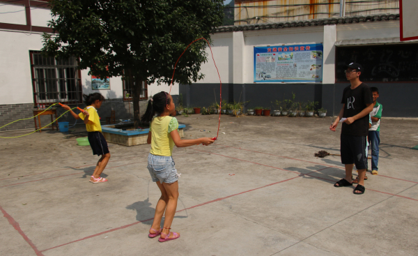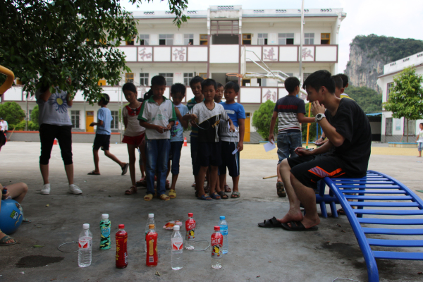7月26日下午,浙江大学材料学院赴广西宜州社会实践团队与合寨小学全体学生举办了一场别开生面的趣味运动会。该趣味运动会针对合寨小学学生平时体育运动兴趣不强、运动时间不足的现状而开展。运动会一共涉及了原地投篮、水中夹弹珠、夹气球、跳绳、投铁圈、运乒乓球等六个游戏。通过一系列活泼有趣的运动形式,激发学生积极参与到运动会中的热情,强健体质,磨炼意志。在原地投篮游戏(图1)中,每位学生有十次投篮机会,在十次投篮中,需要投中四次以上才有资格积分领奖品。虽然烈日炎炎,但是学生们的热情不减,原地投篮处不大一会就排队聚集了十几位学生。由于合寨小学很多孩子为留守儿童,营养跟不上,很多孩子个子较同龄人矮,而且瘦瘦弱弱,高高的篮筐对于他们来说仿佛遥不可及的高度。虽然困难,但是孩子们却没有放弃;一次,两次,不中;三次,四次,依然不中。在老师们都为他们捏一把汗,以为他们会放弃的时候,却欣喜地看到,他们在坚持:使尽浑身力气,向上!向上!向上!即使最终以失败告终,我们却看到了他们沾满汗水的脸上自豪而满足的笑容。当然,也有一些孩子,在开始几次投篮中均以失败告终后,便失去信心,选择放弃。这时,老师们便会上前鼓励他们相信自己,体育运动贵在参与,输赢不重要,坚持到底不放弃的人都是英雄。通过这些趣味运动项目,孩子们渐渐显示出了对于体育运动的巨大兴趣,并且以坚持为乐,我们的趣味运动会也达到了预期的目的。
