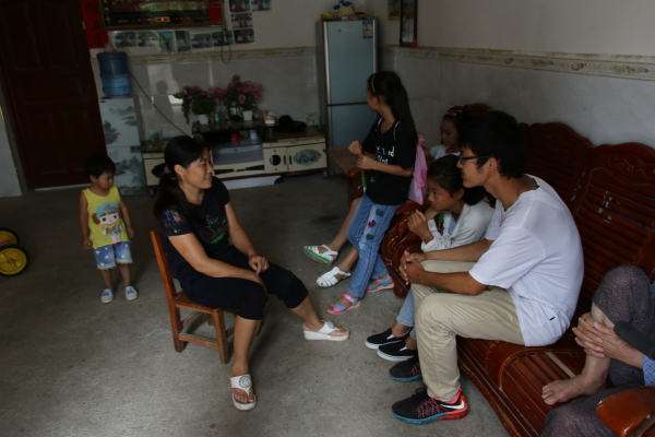 一座简朴的农家小屋前,两道火红的墨字对联下,一位衣着朴素的中年妇女正在和两位年轻老师热切交谈着。她便是研研的母亲,也是家里唯一一个主持家务的中年人。轻松的家访中,老师们了解到,和许多其他孩子一样,研研的父亲与哥哥都正在外出务工。研研能够见到父亲的机会也比较少,或许她略微内向的性格也与此有关。接下来,老师们向研研母亲了解了关于家庭经济状况、研研的课外学习与家务活情况以及未来对研研的期望等。