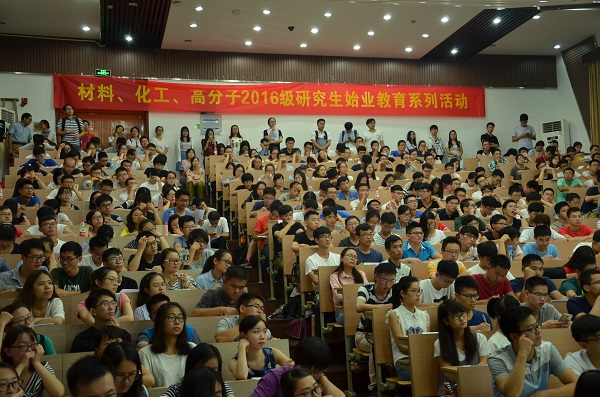 9月13日18:00,第三教学大楼201教室人头攒动,初次相识的热情尚未褪去,同学们相互讲述着自己的趣事,气氛非常融洽。来自材料、化工、高分子三个不同的学院和系的2016级研究生新生齐聚这里,即将迎接一系列的始业教育讲座,第一项议程便是校歌的学唱。