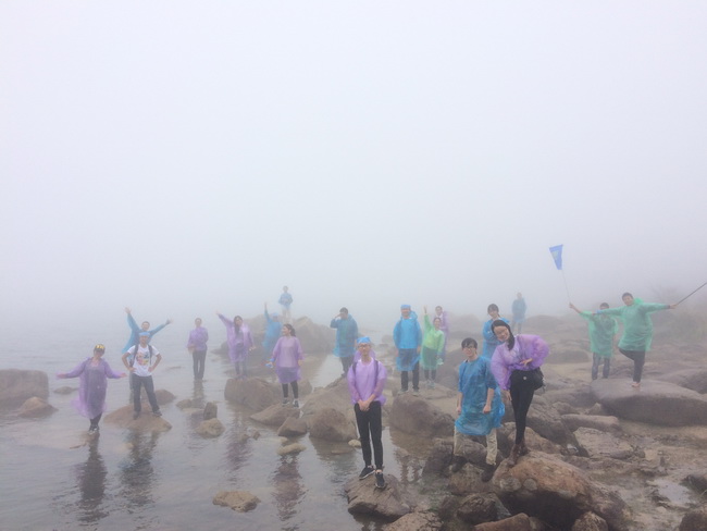 车子把我们送到到安徽的宁国大�村,古道的入口。天上下着蒙蒙细雨,但阻挡不了同学们的豪情,大家纷纷穿上雨披出发,山路蜿蜒,全是石头铺就的路开始湿滑起来。同学们小心翼翼向上爬着,很快有些同学就气喘吁吁了。更要命的是,山上的水势湍急,有些路都被山涧溪水掩没,同学们相互搀扶着走过水流湍急的路段。在路边的小亭子里休息的时候,大家纷纷感慨,革命前辈们的长征的时候比我们可要艰苦多了,那是该要克服多大的困难啊!两个小时的山路后终于到了千顷关,灿然跃出的是一片芦苇荡,还有美丽的浙西天池。天池上浓雾笼罩,犹如在一片大海,一望无边。