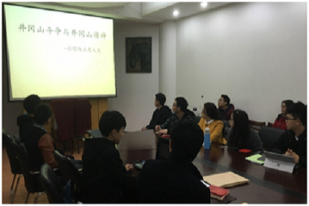 然后,胡洋同志给我们介绍了井冈山的地理位置,讲述了当年共产党是如何开辟出井冈山根据地,以及之后与国民党军队抵抗斗争的故事,其中既有朱毛会师的全盛时期,也有“三月失败”等的曲折发展时期,同志们都深深体会到当年井冈山革命根据地开辟的困难和艰险,除此,他也介绍了当时一些重要的历史人物。