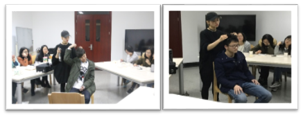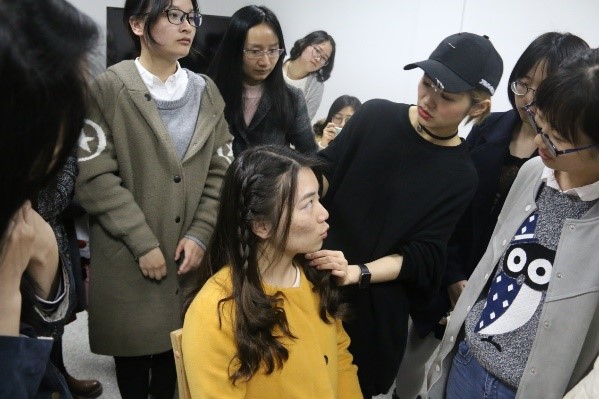 最后,飞扬还给女孩们教授了各种编发技巧。同学们都围过来想要近距离仔细观察编发的步骤,同时向发型师请教各种发型打理的问题。我的脸型适合什么发型呢?我的头发总分叉该怎么打理呢?飞扬耐心得一一讲解同学们提出的问题。同学们都了解了很多关于头发的知识。