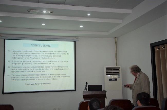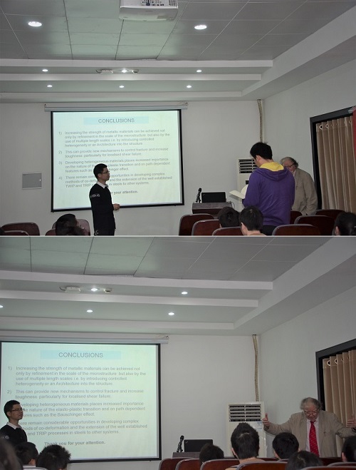 Embury教授讲座的主题是Attempts to Increase Strength and Toughness using Architectured Materials.研究金属材料的人都知道,金属材料塑性与强度难以同时实现是一直以来的难题,两者此消彼长,因此严重制约了金属材料的实际应用。Embury教授是冶金材料专家,在钢铁材料韧性领域进行了多年的研究并取得了丰硕的学术成果。他在讲座中为同学们展示了材料内部“畴”尺寸(如晶粒尺寸、第二相颗粒大小等)对材料塑性屈服的影响,而常用的弥散强化等手段将导致大量的弹塑性转变和包辛格效应。而他为同学们介绍了“Architectured Materials”的概念,这是一种在材料中通过相变引入一定的浓度或体积梯度从而提高材料韧性的方法,并展示了他的研究成果。为同学们带来了精彩的一堂课。