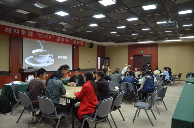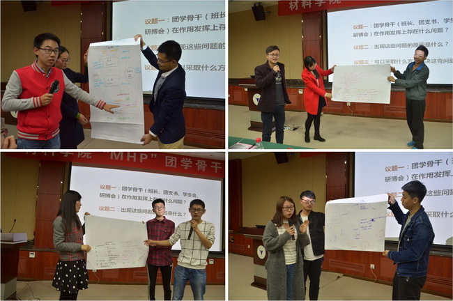 接下来的团体辅导,孙老师为我们引入了“世界咖啡”的讨论模式,针对“团学骨干在日常工作中遇到的问题”进行了深入的交流。“世界咖啡”可谓群策群力,所有的同学都积极分享了自己的看法,献计献策,记录员用思维导图的形式记录了大家想法并进行整理,有组员间的思维发散、亦有不同组间的观点碰撞,除了问题本身,讨论让每一位成员学会更好地倾听,更好地分享,最后的呈现的是集体的智慧。时间有限,大家的交流分享意犹未尽,但今日只是个开始,材料学院MHP团学骨干培训班刚刚开启新的征程,将载着各位学员一起扬帆起航。