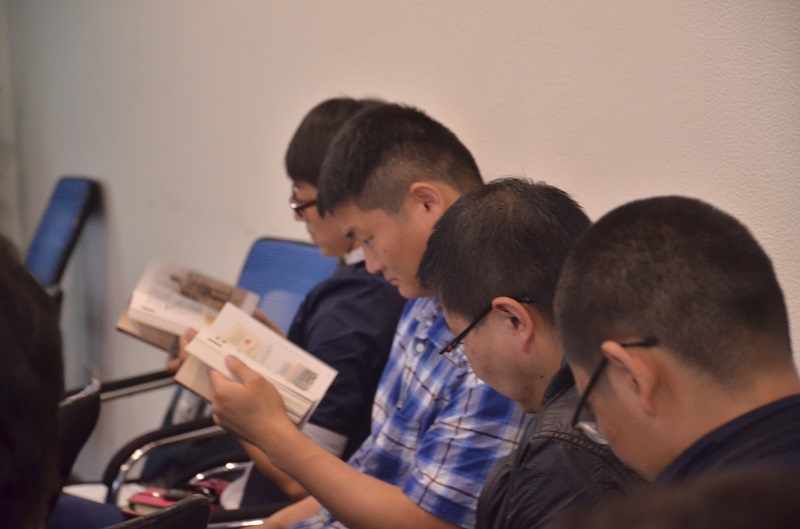 教师们认真翻阅校史手册