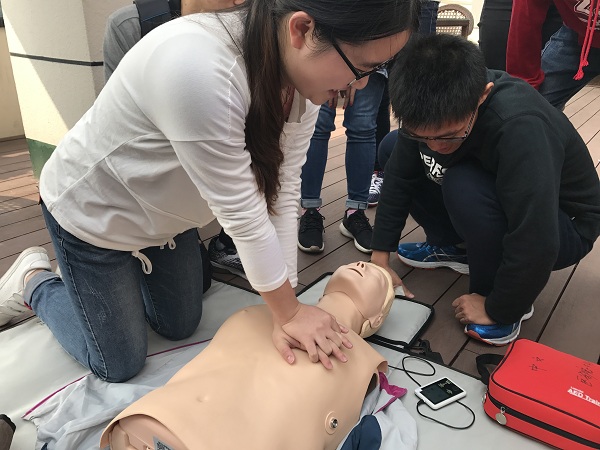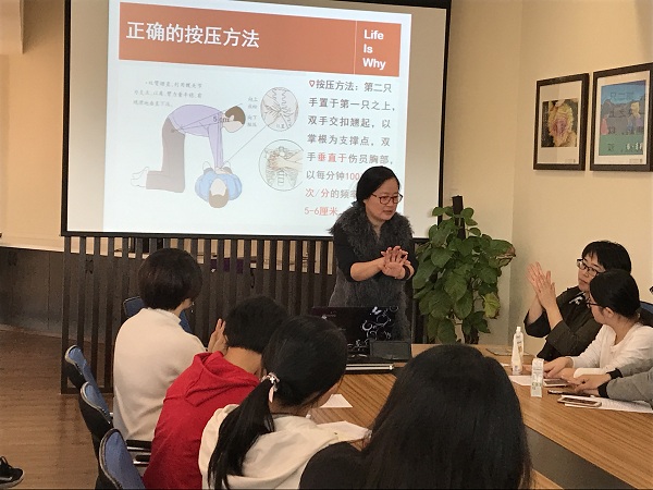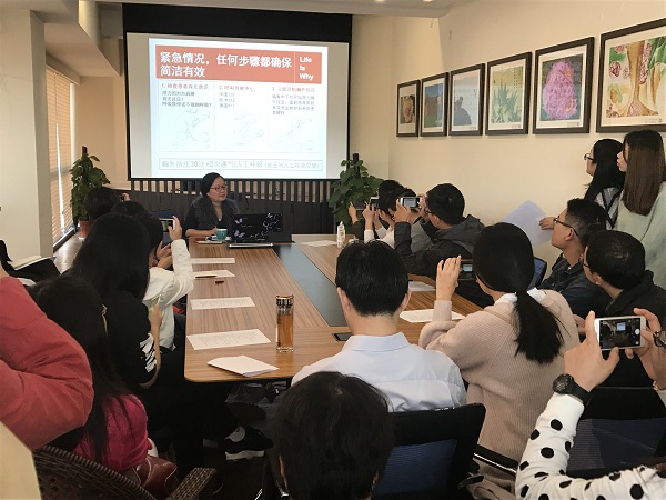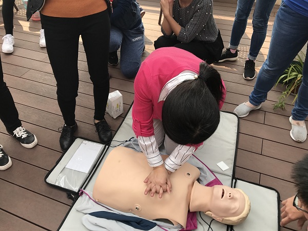 在理论学习之后,急救培训小组成员王亚医生利用人体模型,为大家演示了心肺复苏的具体实施步骤。其中,大家最感兴趣的是电子除颤器的操作,王亚老师也耐心讲解了电子除颤器的使用步骤和注意事项。