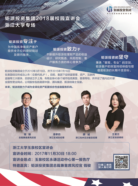 简历投递邮箱:jiayin.xu@jpinvestment.cn,请注明“浙江大学宣讲会”