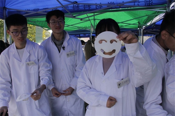 火龙烧字由硝酸钾受热分解的原理设计而成。现场工作人员配好溶液,参与者在滤纸上画上自己想要的图案或者是写字,再由火星引燃,烧出出画的图案。在工作人员的仔细地教导和耐心地帮助下,参与的大家都烧出了很多有趣的图案。有的烧出了表情包,其乐无穷;有的则烧出了一颗爱心,充分烂漫;还有的烧出了自己的潇洒签名,很是酷炫……活动反响热烈,直到2017年的最后一个黄昏来临,摊位上还十分欢快热闹。