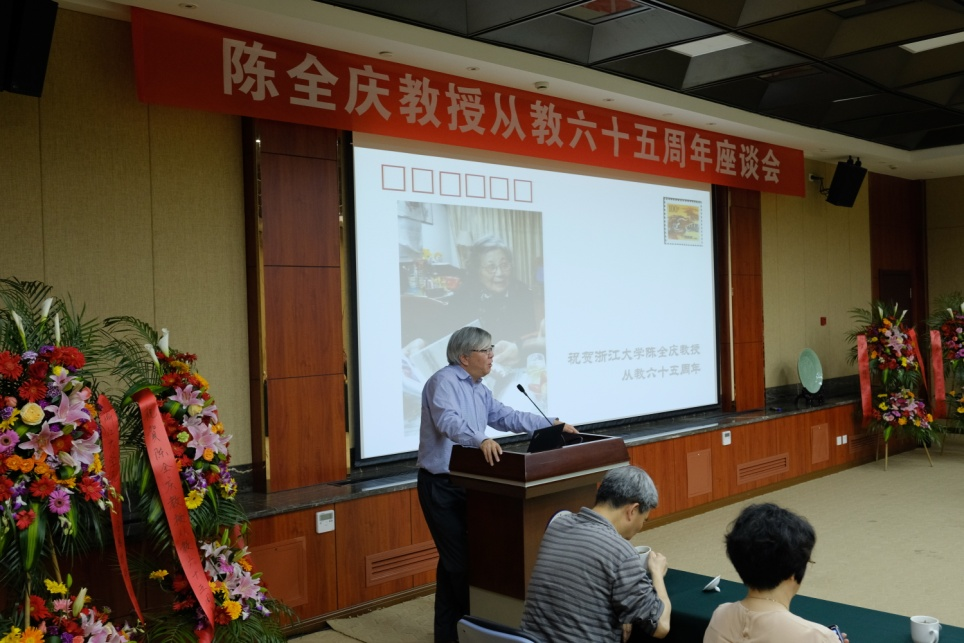 2018年4月28日下午,在陈全庆教授90华诞之际,学院会同无机非金属材料研究所在邵逸夫科学馆隆重举行了陈全庆教授从教六十五周年庆祝座谈会。院长韩高荣教授,无机非金属材料研究所所长钱国栋教授,陈全庆教授的家人,沈锦林教授,王民权教授和18位从美国、荷兰、英国、澳大利亚和祖国各地专程赶来的学生参加了座谈会。九十个春夏秋冬,六十五载的风风雨雨,陈全庆教授以其渊博的学识、严谨的学风、勤奋的工作态度、开朗的性格和卓越的社会活动才能,以及她对社会主义祖国的热爱,在师生中树立了崇高的形象,是当今知识分子的楷模。韩高荣院长代表学院对陈全庆先生从教65周年和90华诞表达了诚挚的祝贺,对陈全庆先生长期以来对浙江大学作出的贡献表示了崇高的敬意。