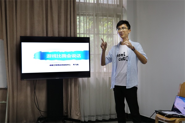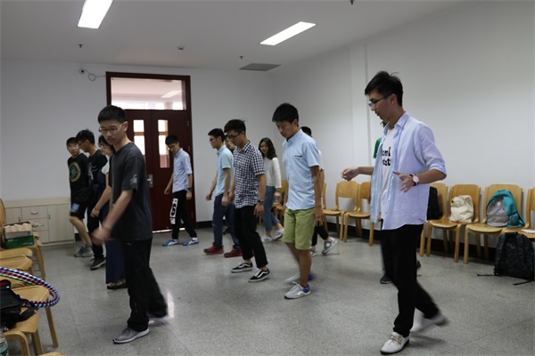 夏日激情如歌,韦飞扬老师首先给我们带来了第一个暖场游戏。跟着节奏跳迪斯科,他首先把16步分解动作演示给同学们看,然后让同学们利用五分钟迅速练习和熟悉节拍,随后就打开手机音乐,让同学们随着欢快的节奏起舞。刚开始的时候,同学们都不是很熟悉,不在一个节拍上,还有互相踩到脚的情况,现场笑声阵阵。经过几次练习,同学们顺利整齐的跳完一曲,不禁给自己鼓起了掌。