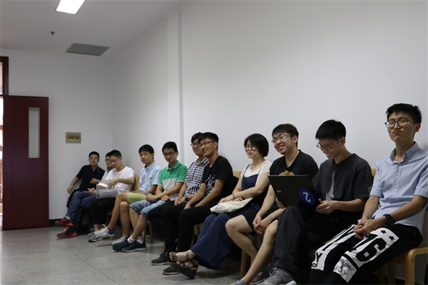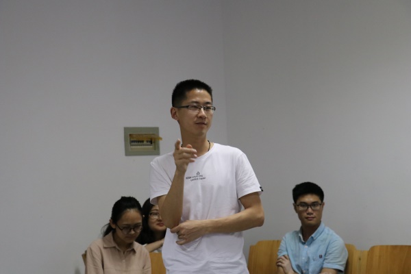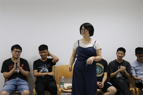 第二个任务是无声换位13位参与同学和主持人共14人是一个组,均分成两边面对面站立,中间有一个空位,要通过空位的移动来使两边的人全部完成位置的调换。同学们首先就想到将纯净水拿过来当作人在模拟,但是人都围在一起造成效率低下。于是有几个同学在旁边用纸笔计算,也有同学在旁边用纸牌从4个人、6个人由少到多的开始模拟。第一次尝试失败了,又经过20分钟的激烈讨论,同学们恍然大悟其中的规律,于是王宣程同学和每个人都讲解了一下,确保每个人都听懂,就开始了没有指挥没有交流的无声换位,只用了几分钟换位全部完成,同学们都开心的鼓起掌来。