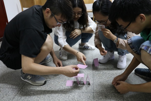 随后,韦飞扬老师给同学们布置了第一个任务――“纸牌屋。同学们分为三个小组,通过团队协作,思考方法,动手实践,用扑克牌搭起一个三层的小屋。看似简单的任务,却要通过团队每个成员之间的相互配合和通力协作才能完成,当第一个组率先完成任务后,完成的同学分开到另外两个组指导其他同学,大家都成功完成了任务。欢呼声和掌声充满了整个教室。