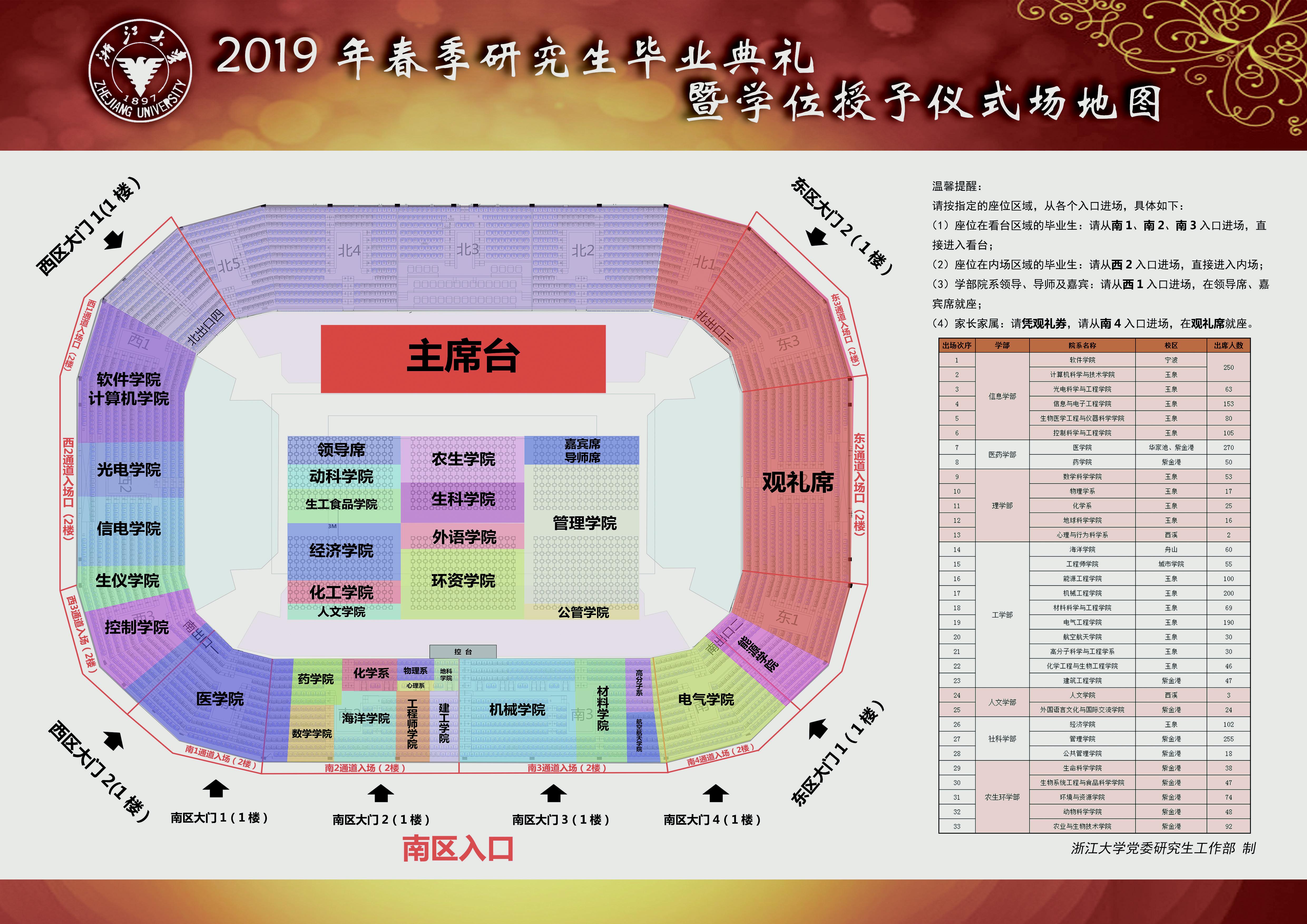 4. 各学院(系)领队老师在3月28日下午2:00到紫金港校区体育馆参加筹备会,并现场熟悉所在学院(系)的场地、通道以及毕业典礼和学位授予仪式的相关程序。