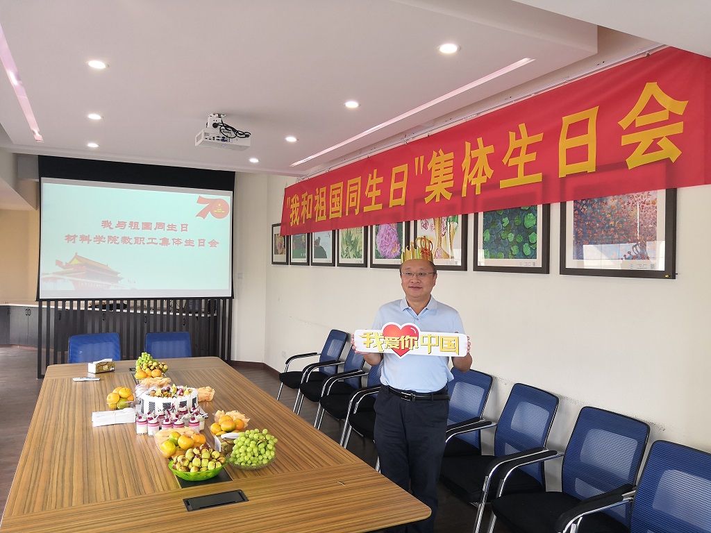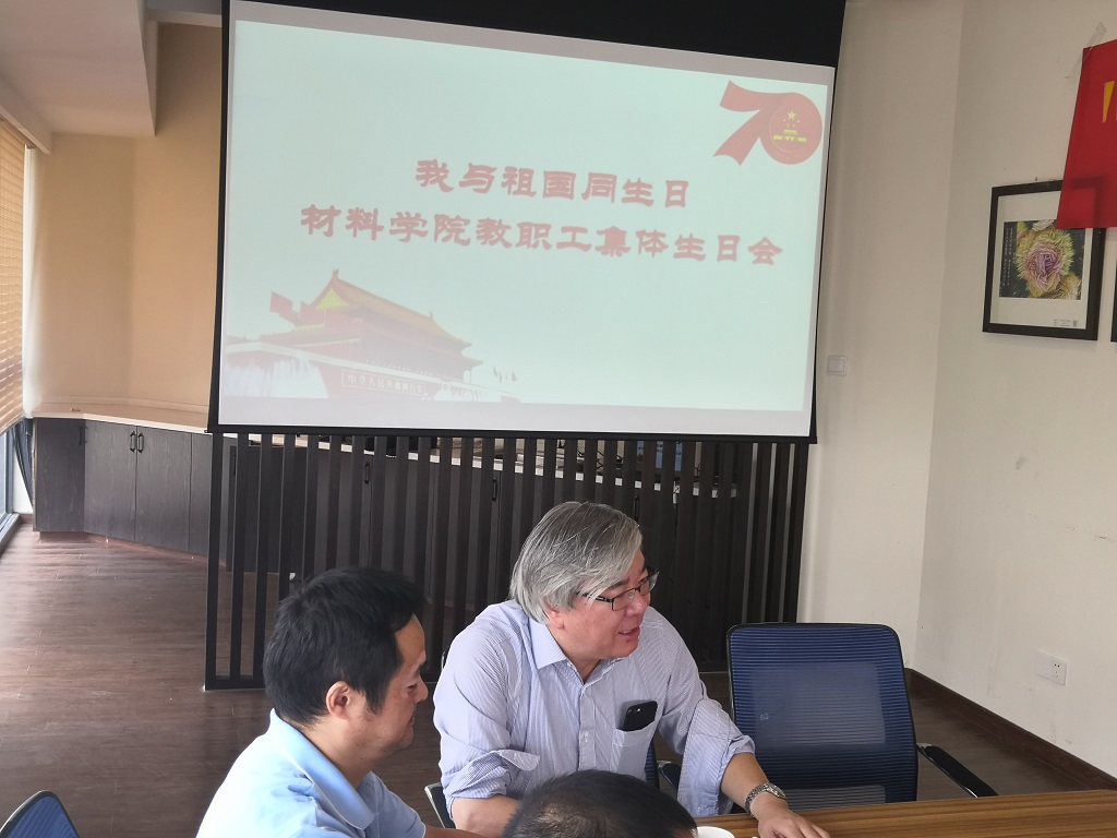 为深入学习贯彻习近平新时代中国特色社会主义思想和党的十九大精神,隆重庆祝中华人民共和国成立70周年,激发全院教职工的爱国热情和工作热情,9月26日,材料学院在学院远望庐咖啡吧举办“我和祖国同生日”暨9-10月集体生日庆祝活动。学院9-10月份生日的寿星、学院领导、工会委员代表近30位教职工参加了此次活动。集体生日会学院工会副主席杨杭生主持。