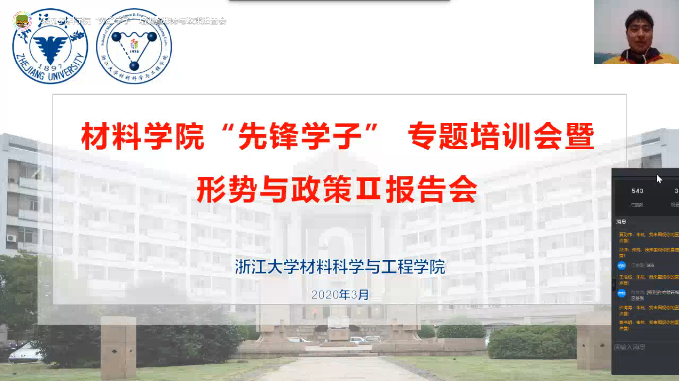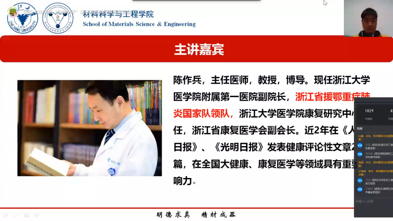2020年3月17日晚,材料学院“先锋学子”专题培训会暨形势与政策Ⅱ报告会通过网络直播的方式顺利举行。本次报告邀请了浙江大学医学院附属第一医院副院长、浙江省援鄂重症肺炎国家队领队、浙江大学医学院康复研究中心主任陈作兵教授作分享。材料学院全体本科生,全体党员、入党积极分子参加报告会,此次报告会利用“钉钉”平台的视频直播等功能开展。