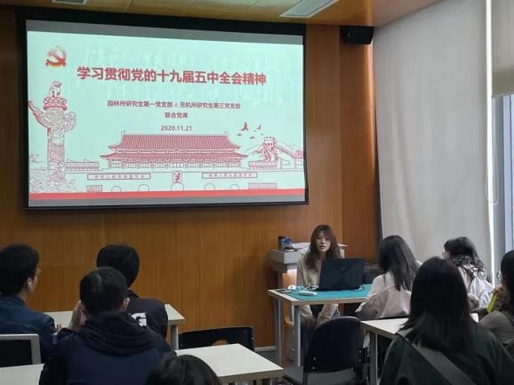 党日活动分为理论学习和实地考察两个部分。上午,无机所第三党支部一行人赶赴浙大紫金港校区与农业与生物技术学院园林所研究生第一党支部成员进行汇合。紧接着,为深入理解全会内容,两支部进行“学习十九届五中全会精神”联合党课活动。园林所研究生第一党支部纪律委员——高聪同志进行了“学习贯彻党的十九届五中全会精神”主题党课的讲解,从经济发展、改革开放、社会文明、生态文明、民生福祉以及国家治理等方面,对“十四五”时期经济社会发展的6大“新”目标进行了详细的介绍。随后,无机所研究生第三党支部书记——刘群获同志针对“十四五”时期关于“生态文明建设实现新进步”的阐述进行了重点讲解。我国努力促进新的发展理念、新的生产生活方式以及新的能源配置向绿色低碳转型,坚定走生产发展、生活富裕、生态良好的文明发展道路。