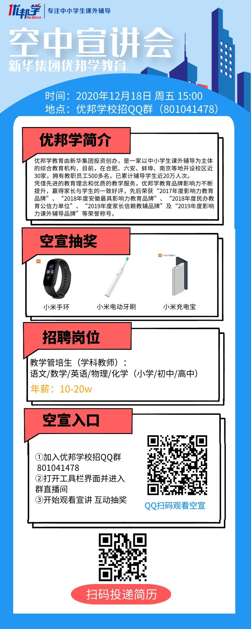 优邦学教育由新华集团投资创办,是一家以中小学生课外辅导为主体的综合教育机构,目前,在合肥、六安、蚌埠、南京等地开设校区近30家,拥有教职员工500多名,已累计辅导学生近20万人次。
