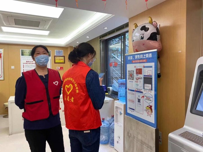 趁着微凉的清晨,五支部的志愿者们来到了位于市区的血液中心武林院区。工作人员向大家介绍说,这里每天都有很多充满奉献精神的志愿者前来献血,包括成分血和全血。在准备献血之前需要网上登记填表以及进行相关的血液检测,确认无误后即可捐献全血。