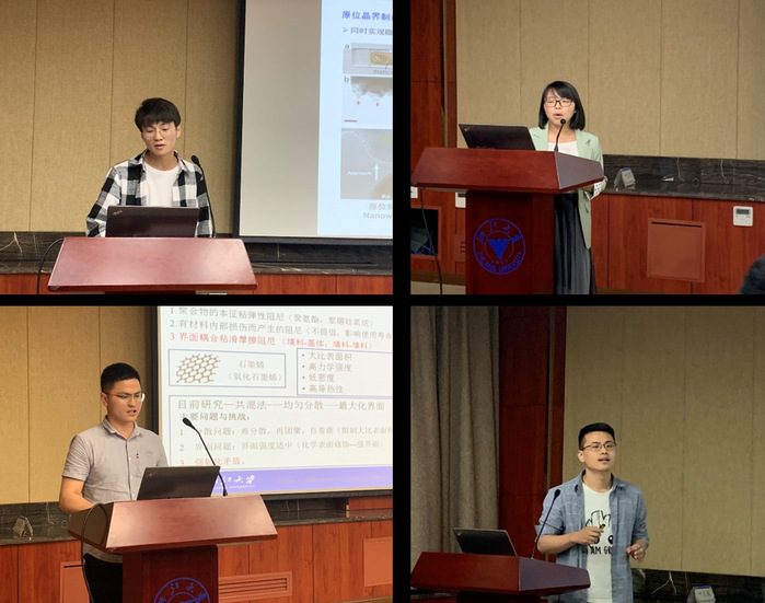 随后电镜中心的陈映彬同学介绍了金属材料原子尺度的晶界变形机制,考察了晶界协调变形介导的晶粒湮灭现象,具体研究了晶粒湮灭过程中晶界变形的耦合关系、剪切循环变形中的晶界应力变化等,提出了一种孪晶界协调变形作用下晶界迁移导致的多重孪晶形成的几何模型。材料物理所的张碧辉同学介绍了A位离子有序Ruddlesden-Popper结构陶瓷的杂化非常规铁电性,分别研究了偶数层和奇数层R-P结构的铁电性。卢文江同学研究了高阻尼纳米复合材料的结构设计及优化。通过对GO涂层形貌的调整和微观界面的设计,使得复合泡沫内部的界面能量耗散机制最终达到了GO-PU和GO-GO的最佳界面摩擦组合。最后,李华正同学分析了钙钛矿微纳结构的制备机理并研究了其光学性能。制备出的CsPbBr纳米线发光稳定、量子荧光效率高,作为绿色发光组件成功组装成白光LED,可以暴露在空气中长时间稳定发白光。