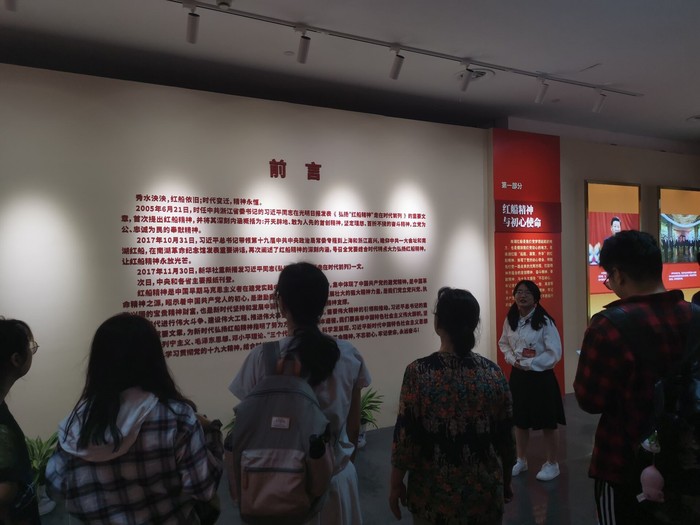 首先,支部成员集体参观了校党建馆。迈过一片葱郁的树丛,大家跟随讲解员的脚步,缓慢走近那段带有浙大求是烙印的峥嵘岁月。自1897年求是书院在杭州创立以来,爱国基因便深植浙大人的新中。从学校走出的先进知识分子和社会进步力量,点燃了华夏大地上思想解放的星星之火。从五四运动到红船精神的阐发,大家全神贯注地聆听讲解,细细感悟。