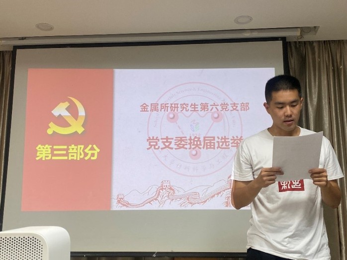 在工作总结完毕后,党支部进行党支委换届选举。选举采取无记名投票方式,由监票人陆迪同志和计票人毕嘉鹏同志主持选举、清点选票、统计选票,并宣读投票结果。新一届金属所研究生第六党支部委员会由王宣程、吕岭、张硕卿、戚家程四人组成。