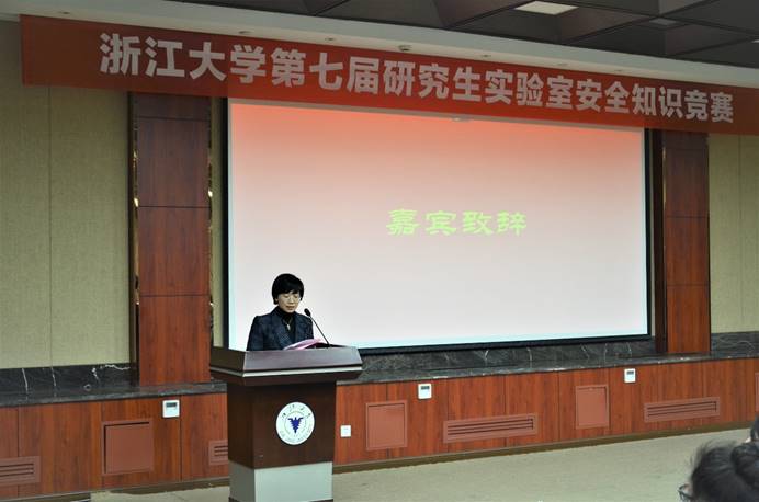 赛前,王育萍老师为本次决赛致开幕辞。王老师首先对各位嘉宾和同学们的到来表示欢迎、对学校各相关部门对本次比赛的大力支持表示感谢,也表达了材料学院对本次活动的高度重视。她表示,浙江大学材料学院创办的以“Lab & Life”为主题的研究生实验室安全文化建设项目已举办六届,其目的就是以赛促练,强化安全红线意识,提升广大研究生同学的实验室安全意识和技能,促进实验室安全工作科学化、规范化、常态化。针对本次决赛,她希望广大研究生积极培养实验室安全知识和技能,牢固树立实验室安全防范意识,大力发展实验室的安全文化,积极探索以实验室为载体的学科魅力。