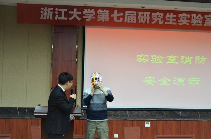 在人气奖现场评选环节,各队选手对自己的实验室安全视频理念进行介绍,根据专业特点将实验安全注意事项以正误对比、默剧、动画拟人等多种形式加以展现。而后的现场观众答题和消防自救呼吸器佩戴演示互动环节,观众们踊跃参与,掌声雷动,进一步加深了同学们对实验室安全知识的了解。