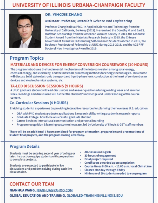 为开拓本科生国际视野,学院持续推进与海外一流高校合作,开展多样化的海外交流项目。今年因受全球疫情影响,海外出行仍然暂缓。为使本科生仍能体验海外全英文课程,开拓国际学术视野,现组织开展伊利诺伊大学厄巴纳-香槟分校暑期线上课程。