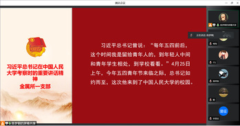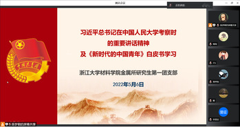 2022年5月6日浙江大学材料学院金属所研究生第一团支部使用腾讯会议开展“习近平总书记在中国人民大学考察时的重要讲话精神及《新时代的中国青年》白皮书学习”主题团课。