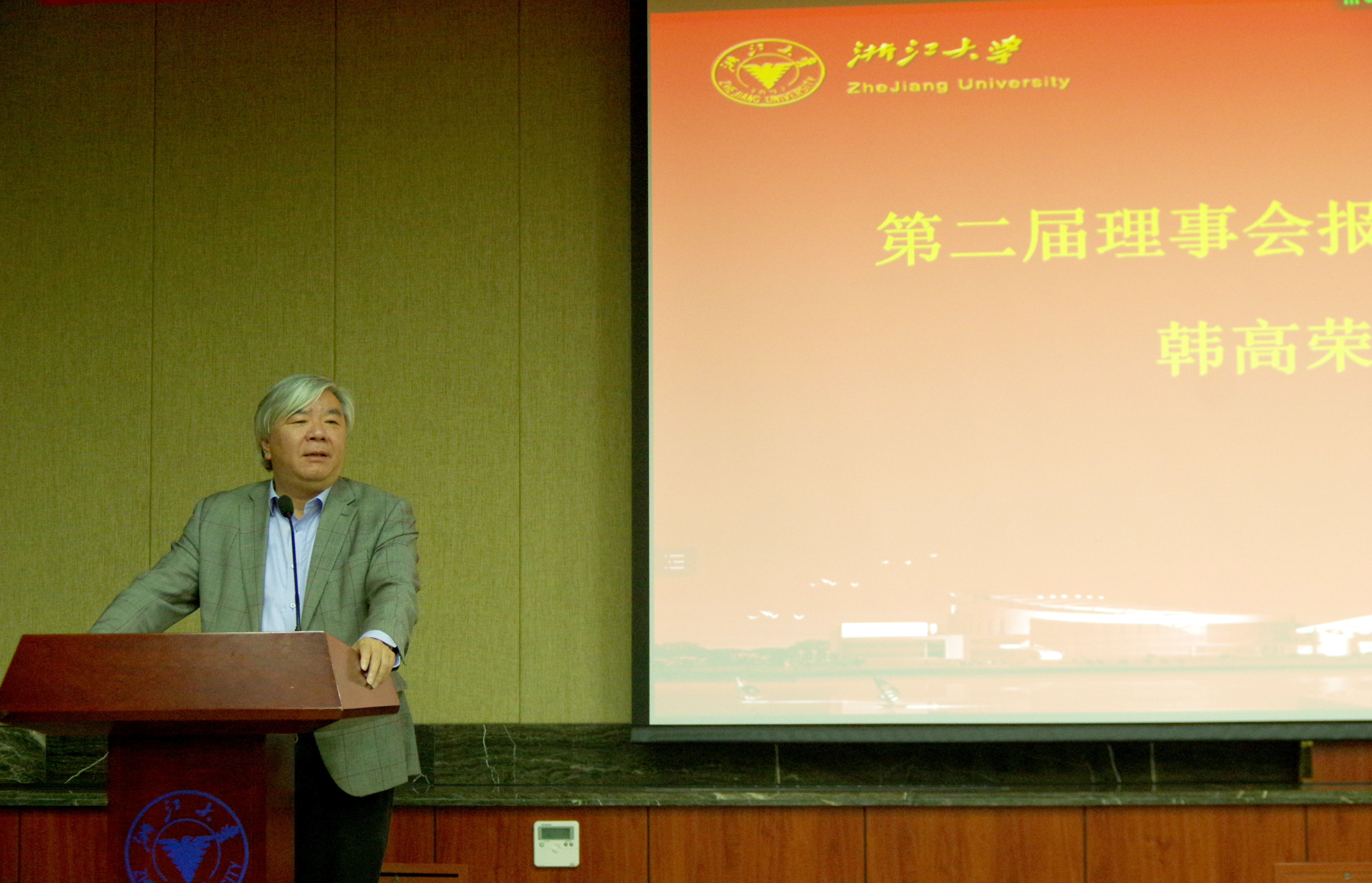 接下来,韩高荣老师代表第二届理事会作工作总结汇报。他从三方面回顾了过去几年取得的成果。以信息化为手段,不断强化校友联络工作,校友队伍不断壮大;以服务校友为宗旨,开展值年返校、专题报告等活动,推动校友学院紧密联系;获得校友广泛支持,成立师长奖学金等,促进学院快速发展。