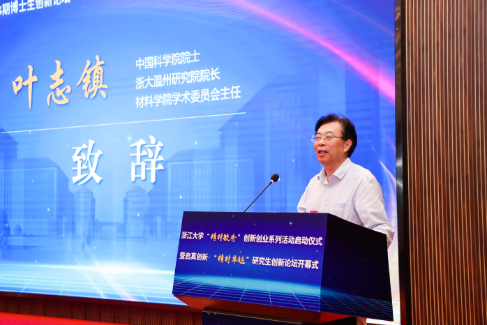 材料学院学术委员会主任叶志镇院士致辞。惟创新者进,惟创新者强,惟创新者胜。在当下国际竞争环境中,个人成才与国家发展都与创新密不可分。叶院士说,青年之于社会,犹新鲜活泼细胞之于人身,理应走在创新前列。在时代发展的今天,大力实施“科教兴国”战略,努力培养广大青年的创新创业意识,造就一代符合未来发展要求的高素质人才,已经成为实现中华民族伟大复兴的时代要求。在看到本次活动热烈空前的报名情况后,叶院士对参赛的选手们满怀期待,期望他们立足社会,有效创新;聚焦实际,有理创新;产学结合,有利创新。