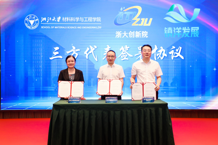 本次活动能够为青年材子们提供广阔的舞台,激发学校师生的创新创业活力,更是离不开学校、学院和企业共同的保驾护航。在热烈的掌声中,浙江大学创新技术研究院有限公司总经理赵文宇、镇洋发展股份有限公司总经理周强和浙江大学材料学院党委书记王晓燕作为三方代表上台,正式签署“精材毓秀”创新创业系列活动合作协议。