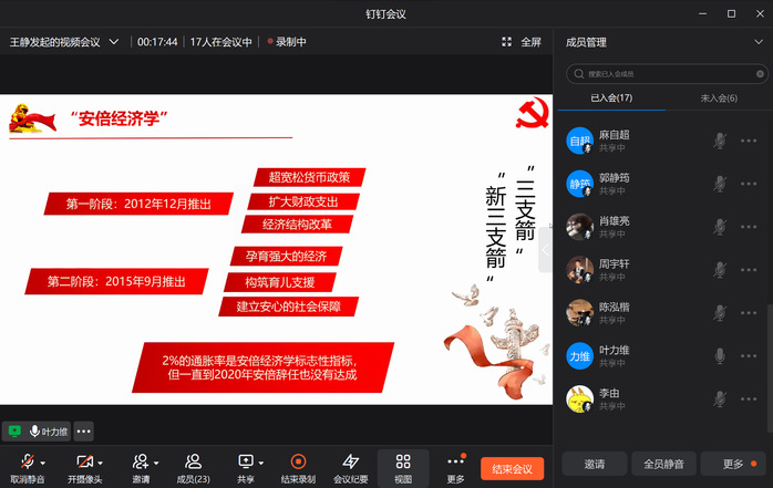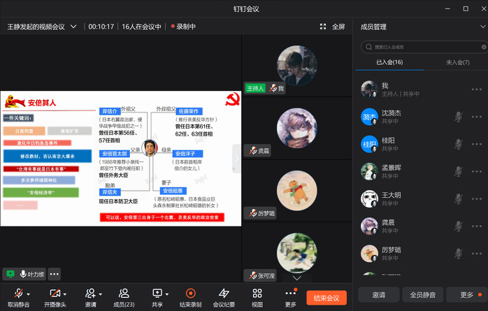 在描绘安倍被刺的事件时,叶力维同志具体展开了对刺杀动机、各方反应的描述并将其与网上热议的其他话题联系,最后引出问题与讨论。会上同志们踊跃发言,气氛活跃。
